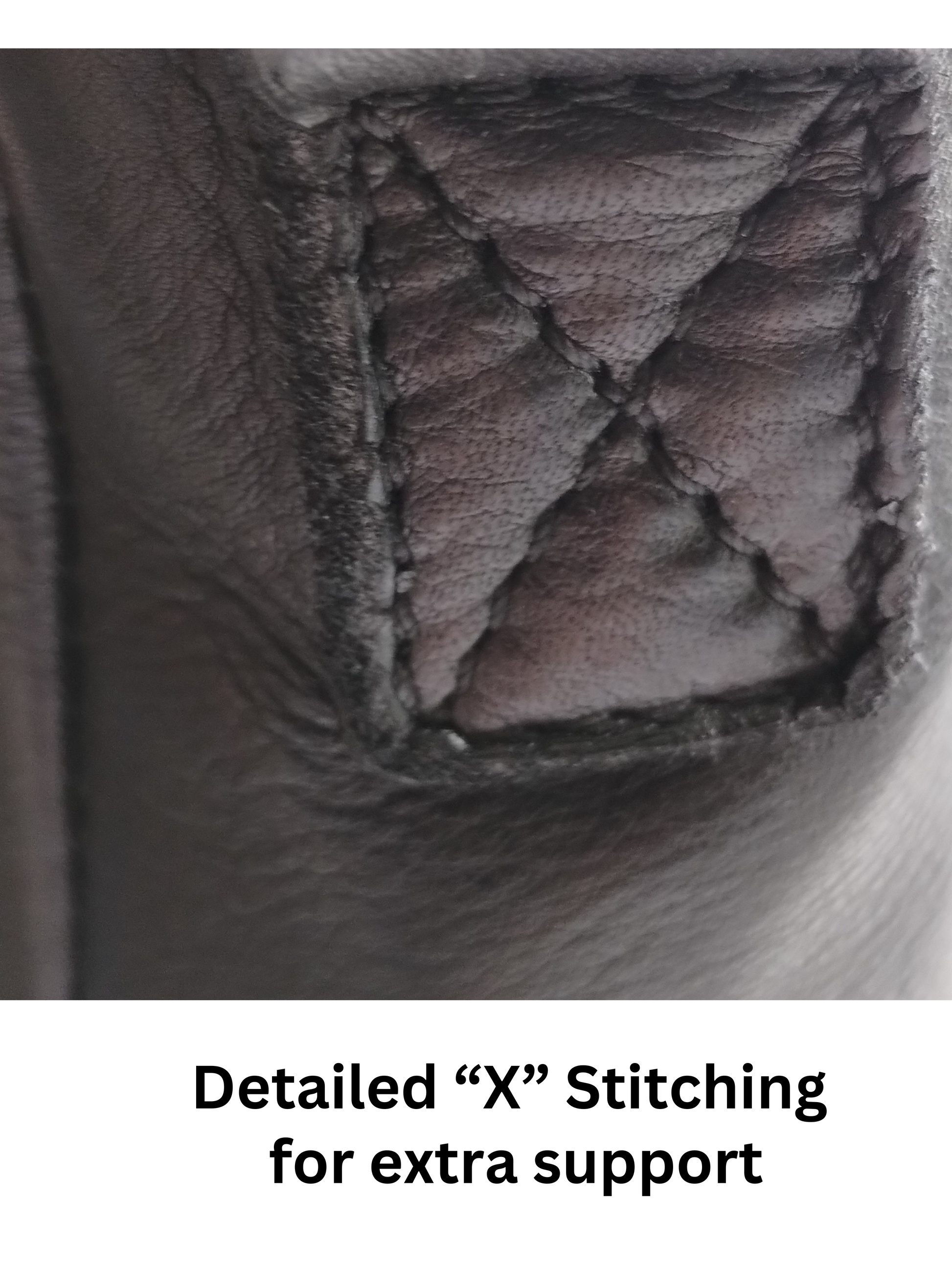 Notice the detail in our square plus "X" stitching for a stronger sewn handle. And see the side strap stitching with the same detail.