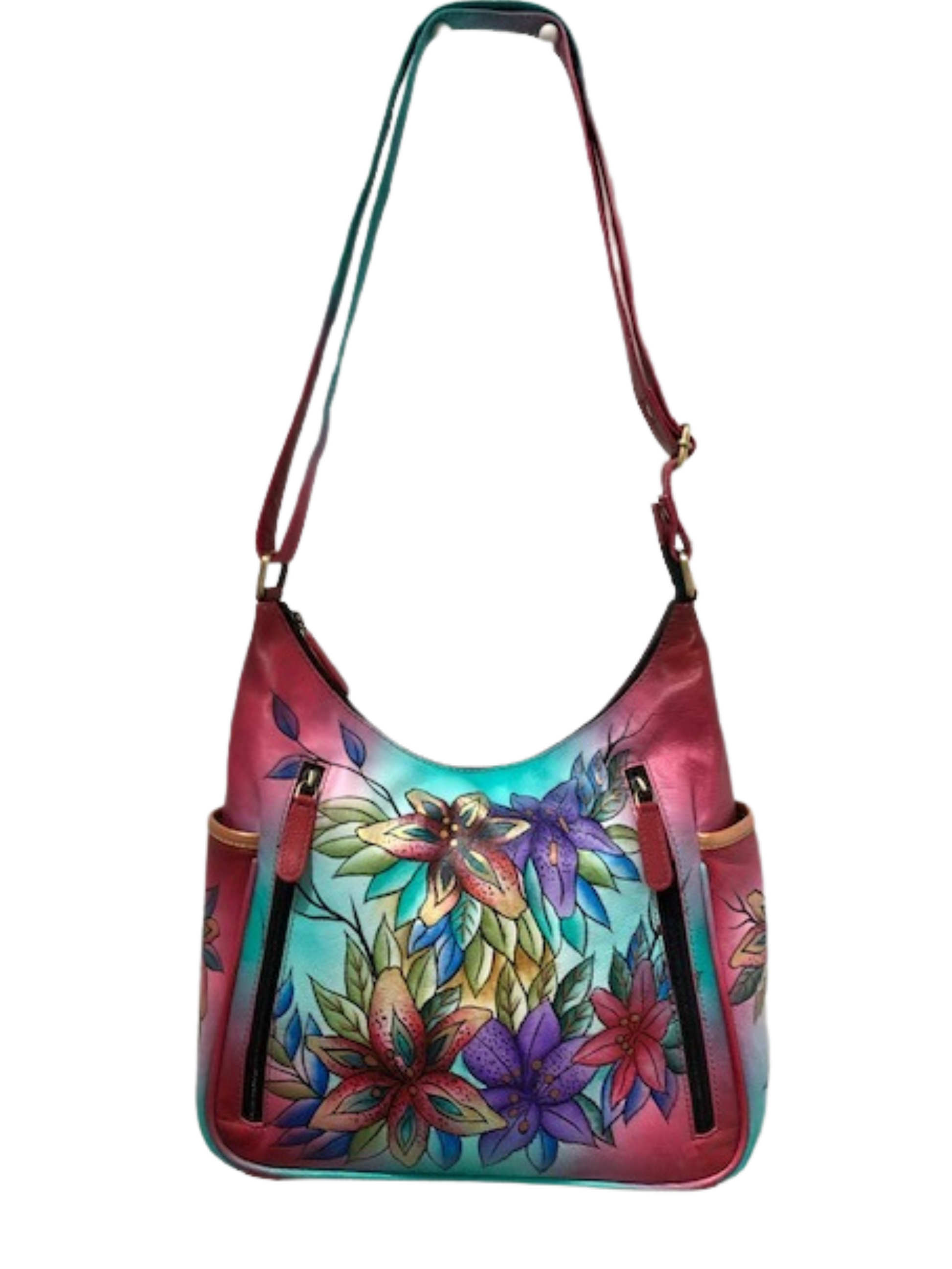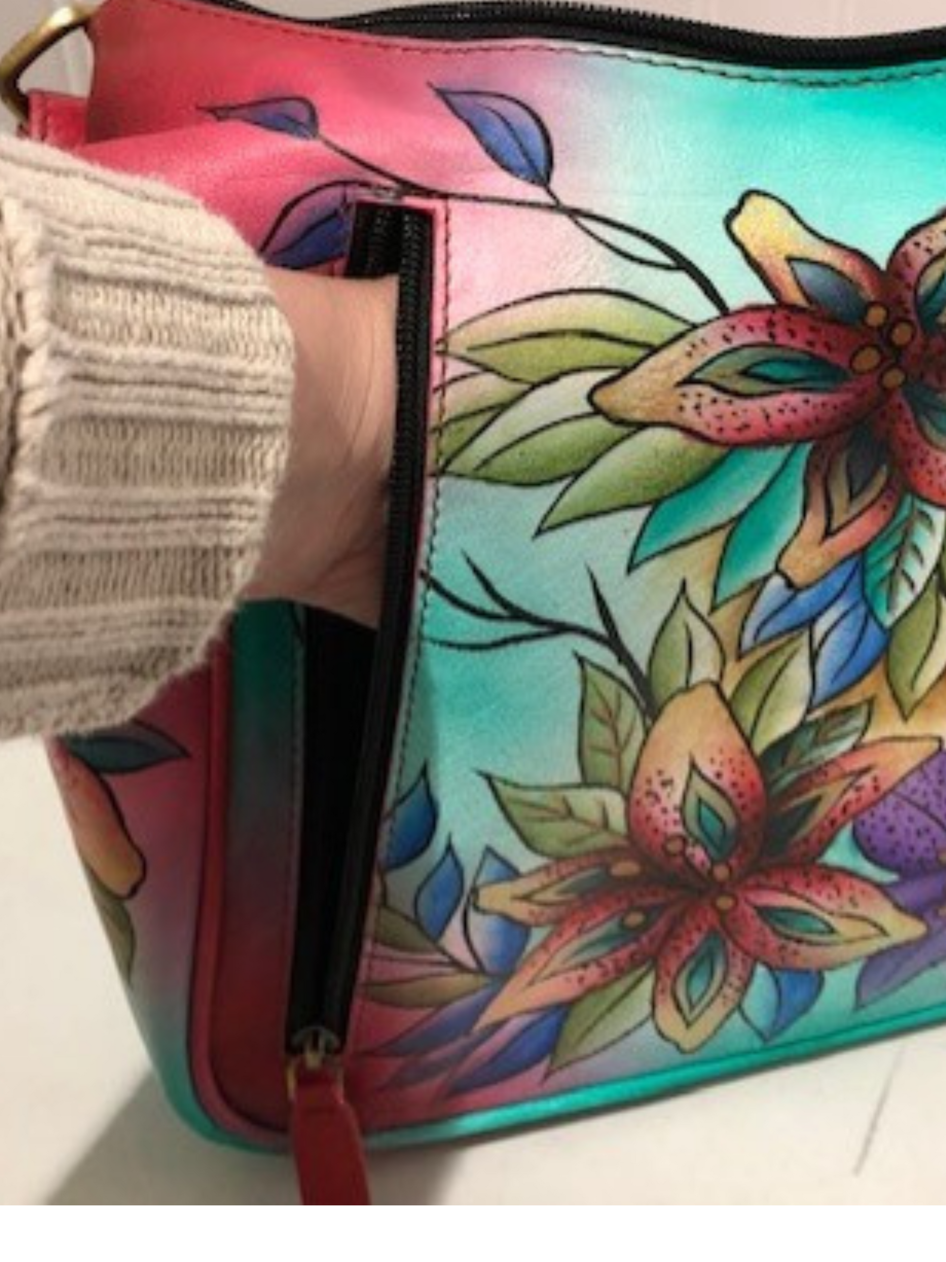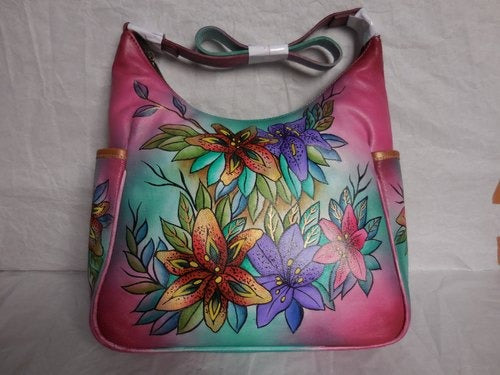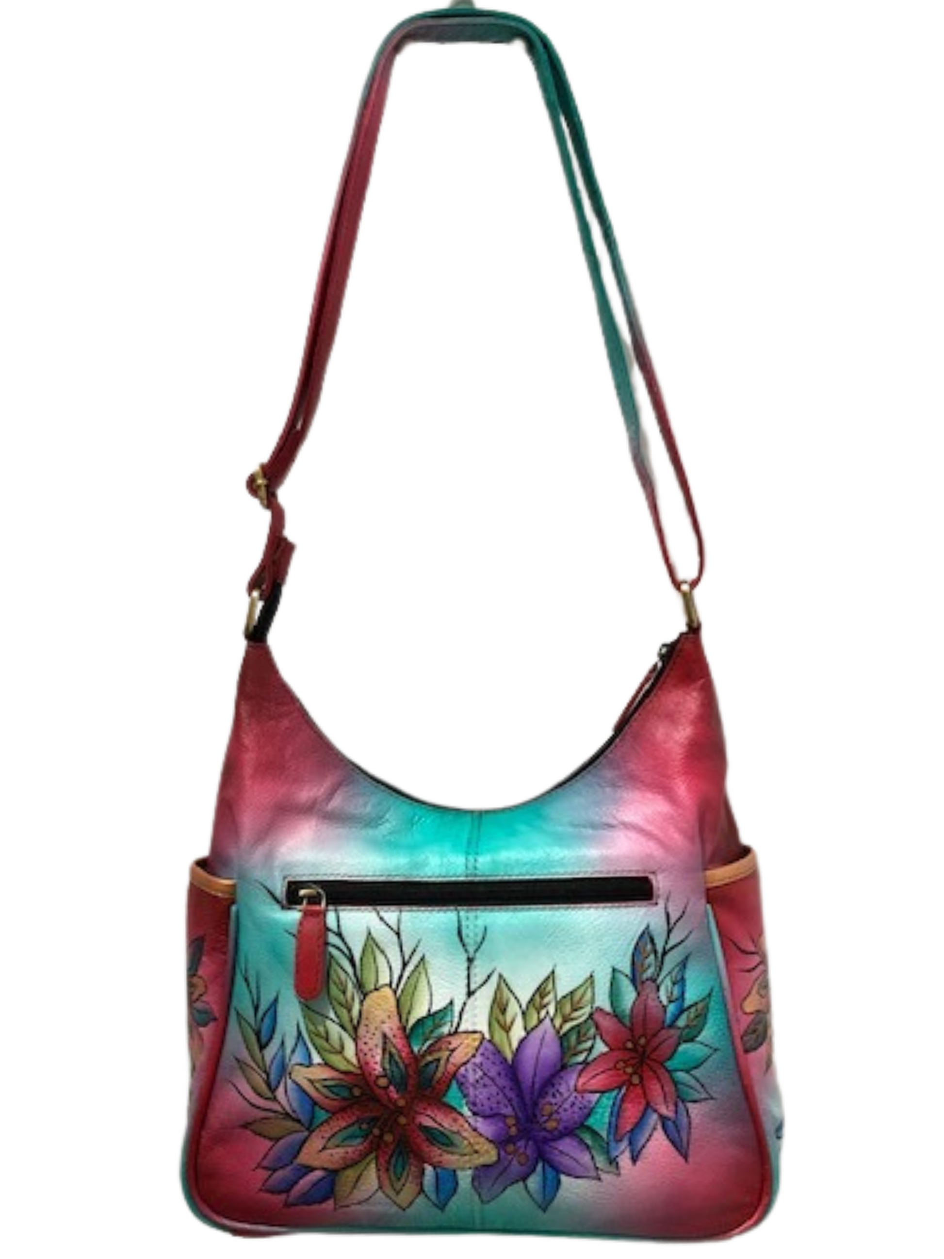 You don't have to carry to appreciate owning this handbag because it is absolutely breathtaking. Warm colorful flowers adorn the front and back of the beauty. Which one is your favorite? There is plenty of room for your goodies inside and the two zippers on the backside will house your piece. There are also two roomy outside pockets for water bottles or your cell phone. The inside is spacious with two slide in compartment and one inside zipper compartment. Order this now and carry around your little slice of paradise! Or you could give this as a gift and brighten up a loved one day as well. (Does not have outside locking zippers)